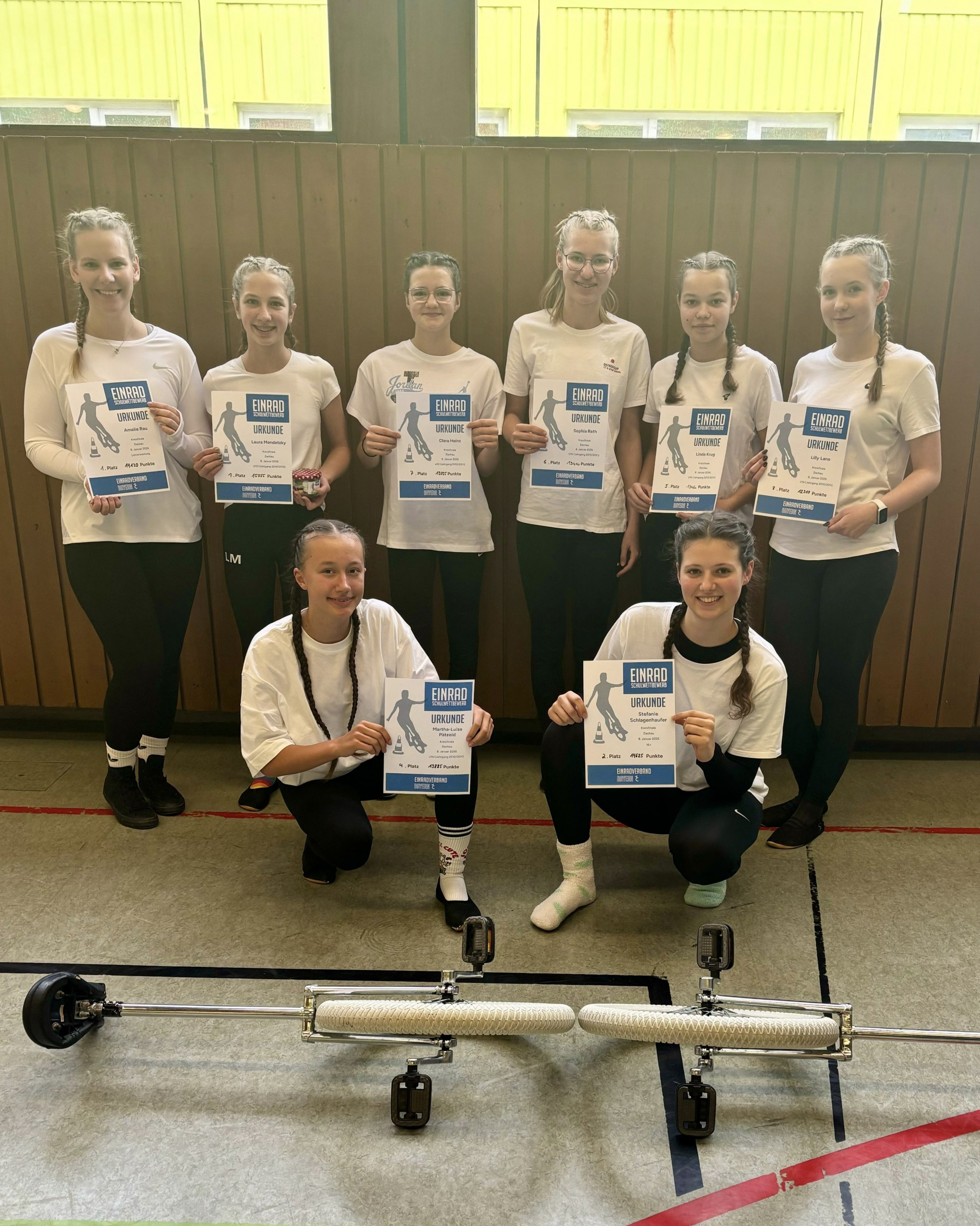 Am 8. Januar nahmen mehrere unserer Einradfahrerinnen (zum Teil Schülerinnen des Max-Mannheimer-Gymnasiums Grafing) am Schulwettbewerb Einrad in Dachau teil. In sieben abwechslungsreichen Disziplinen stellten sie ihr Können in Schnelligkeit, Geschicklichkeit und verschiedenen Tricks unter Beweis.